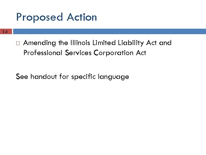 Proposed Action 14 Amending the Illinois Limited Liability Act and Professional Services Corporation Act See handout for specific language