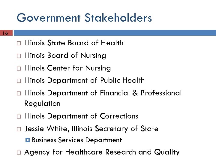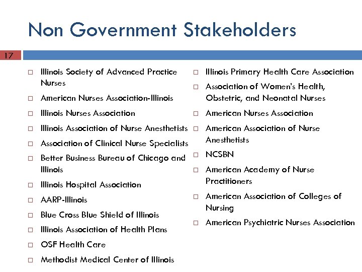 Government Stakeholders 16 Illinois State Board of Health Illinois Board of Nursing Illinois Center for Nursing Illinois Department of Public Health Illinois Department of Financial & Professional Regulation Illinois Department of Corrections Jessie White, Illinois Secretary of State Business Services Department Agency for Healthcare Research and Quality