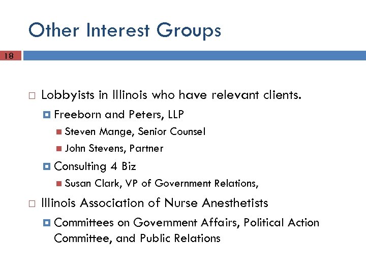 Other Interest Groups 18 Lobbyists in Illinois who have relevant clients. Freeborn and Peters, LLP Steven Mange, Senior Counsel John Stevens, Partner Consulting Susan 4 Biz Clark, VP of Government Relations, Illinois Association of Nurse Anesthetists Committees on Government Affairs, Political Action Committee, and Public Relations