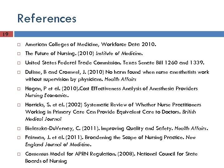 References 19 American Colleges of Medicine, Workforce Data 2010. The Future of Nursing. (2010) Institute of Medicine. United States Federal Trade Commission. Texas Senate Bill 1260 and 1339. Dulisse, B and Cromwel, J. (2010) No harm found when nurse anesthetists work without supervision by physicians. Health Affairs Hogan, P et al. (2010). Cost Effectiveness Analysis of Anesthesia Providers Nursing Economics. Horricks, S. et al. (2002) Systematic Review of Whether Nurse Practitioners Working in Primary Care Can Provide Equivalent Care to Doctors. British Medical Journal Bielaszka-Du. Vernay, C. (2011). Improving Quality and Safety. Health Affairs. Fairman, J. et al. (2011). Broadening the Scope of Nursing Practice. New England Journal of Medicine. Consensus Model for APRN Regulation. (2008). National Council for State Boards of Nursing