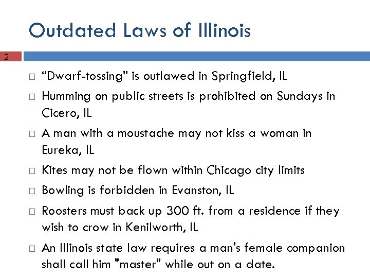 Outdated Laws of Illinois 2 “Dwarf-tossing” is outlawed in Springfield, IL Humming on public streets is prohibited on Sundays in Cicero, IL A man with a moustache may not kiss a woman in Eureka, IL Kites may not be flown within Chicago city limits Bowling is forbidden in Evanston, IL Roosters must back up 300 ft. from a residence if they wish to crow in Kenilworth, IL An Illinois state law requires a man's female companion shall call him "master" while out on a date.