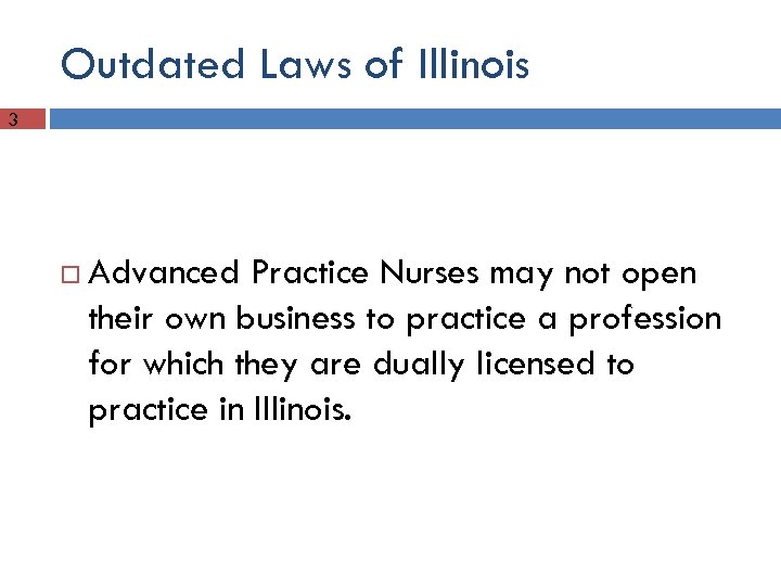 Outdated Laws of Illinois 3 Advanced Practice Nurses may not open their own business to practice a profession for which they are dually licensed to practice in Illinois.