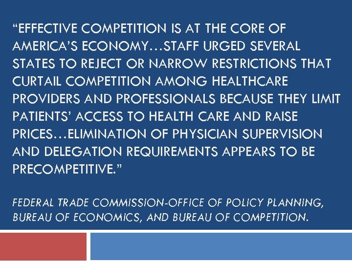 “EFFECTIVE COMPETITION IS AT THE CORE OF AMERICA’S ECONOMY…STAFF URGED SEVERAL STATES TO REJECT OR NARROW RESTRICTIONS THAT CURTAIL COMPETITION AMONG HEALTHCARE PROVIDERS AND PROFESSIONALS BECAUSE THEY LIMIT PATIENTS’ ACCESS TO HEALTH CARE AND RAISE PRICES…ELIMINATION OF PHYSICIAN SUPERVISION AND DELEGATION REQUIREMENTS APPEARS TO BE PRECOMPETITIVE. ” FEDERAL TRADE COMMISSION-OFFICE OF POLICY PLANNING, BUREAU OF ECONOMICS, AND BUREAU OF COMPETITION.