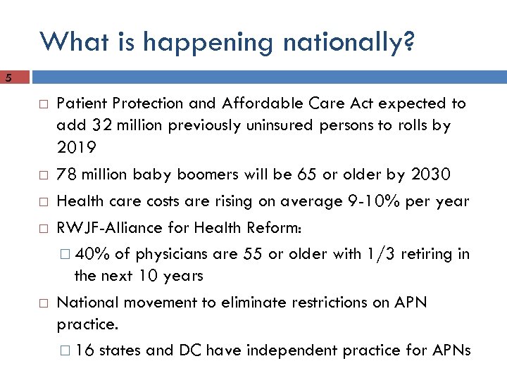 What is happening nationally? 5 Patient Protection and Affordable Care Act expected to add 32 million previously uninsured persons to rolls by 2019 78 million baby boomers will be 65 or older by 2030 Health care costs are rising on average 9 -10% per year RWJF-Alliance for Health Reform: 40% of physicians are 55 or older with 1/3 retiring in the next 10 years National movement to eliminate restrictions on APN practice. 16 states and DC have independent practice for APNs