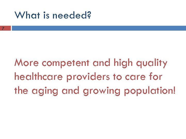 What is needed? 7 More competent and high quality healthcare providers to care for the aging and growing population!