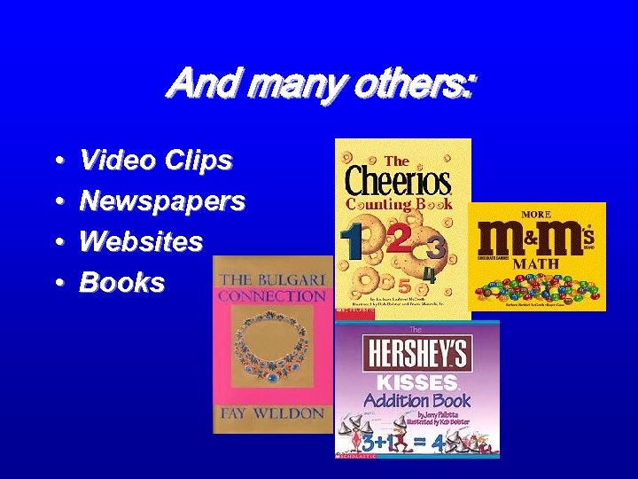 And many others: • • Video Clips Newspapers Websites Books