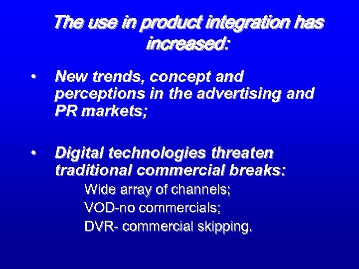 The use in product integration has increased: • New trends, concept and perceptions in the advertising and PR markets; • Digital technologies threaten traditional commercial breaks: Wide array of channels; VOD-no commercials; DVR- commercial skipping.