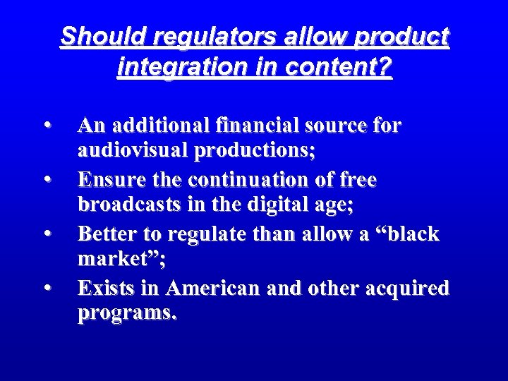 Should regulators allow product integration in content? • • An additional financial source for audiovisual productions; Ensure the continuation of free broadcasts in the digital age; Better to regulate than allow a “black market”; Exists in American and other acquired programs.