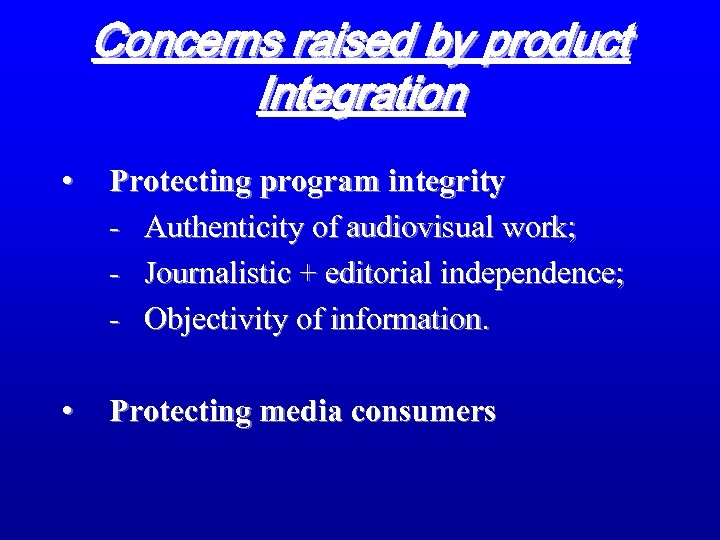 Concerns raised by product Integration • Protecting program integrity - Authenticity of audiovisual work; - Journalistic + editorial independence; - Objectivity of information. • Protecting media consumers