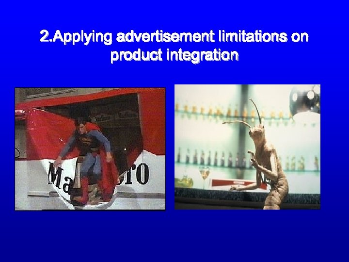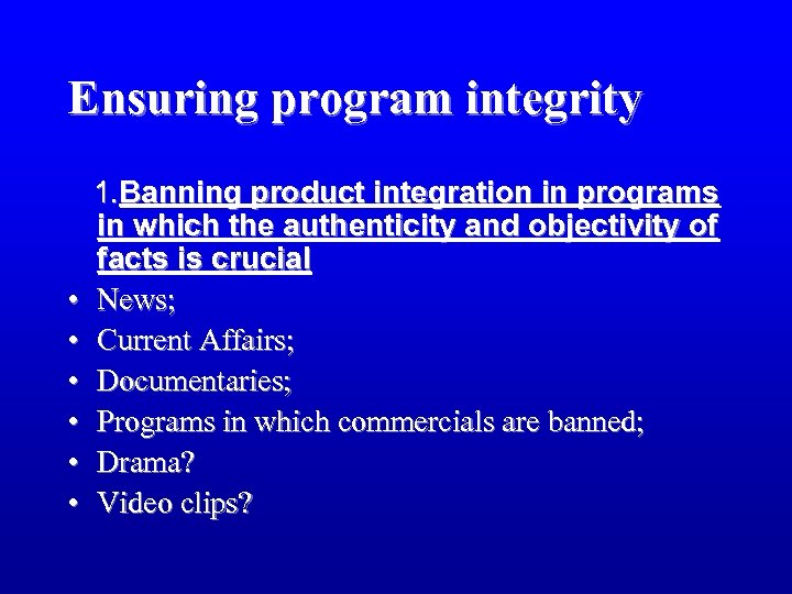 Ensuring program integrity • • • 1. Banning product integration in programs in which the authenticity and objectivity of facts is crucial News; Current Affairs; Documentaries; Programs in which commercials are banned; Drama? Video clips?