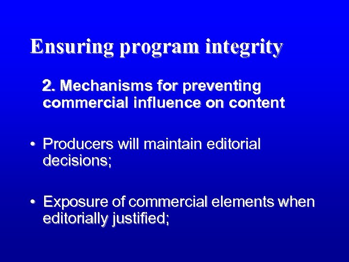 Ensuring program integrity 2. Mechanisms for preventing commercial influence on content • Producers will maintain editorial decisions; • Exposure of commercial elements when editorially justified;