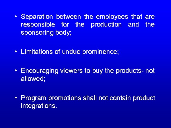 • Separation between the employees that are responsible for the production and the sponsoring body; • Limitations of undue prominence; • Encouraging viewers to buy the products- not allowed; • Program promotions shall not contain product integrations.