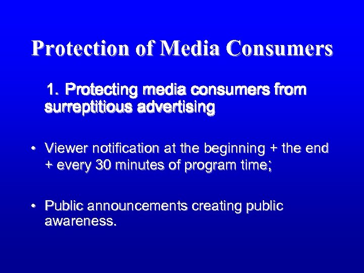 Protection of Media Consumers 1. Protecting media consumers from surreptitious advertising • Viewer notification at the beginning + the end + every 30 minutes of program time; • Public announcements creating public awareness.