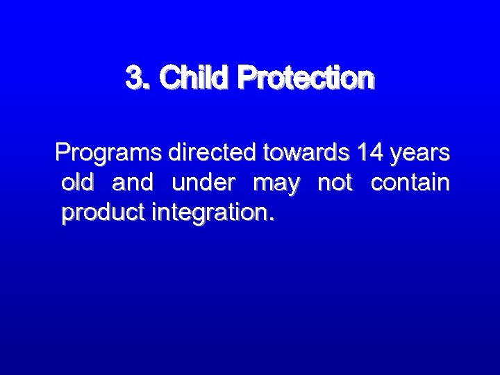 3. Child Protection Programs directed towards 14 years old and under may not contain product integration.