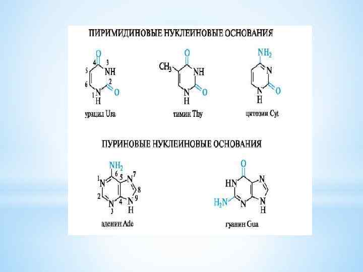 В химии нуклеиновых кислот входящие в их состав гетероциклические соединения пиримидинового и пуринового рядов обычно называют нуклеиновыми основаниями. Нуклеиновые основания в качестве заместителей в гетероцикле могут содержать: • либо оксогруппу, как в урациле и тимине; • либо аминогруппу, как в аденине; • либо одновременно обе эти группы, как в цитозине и гуанине. Кислородсодержащие основания представлены лактамными таутомерными формами, в которых ароматичность не нарушена. Для всех оснований приняты сокращенные трехбуквенные обозначения, составленные из первых букв их латинских названий.