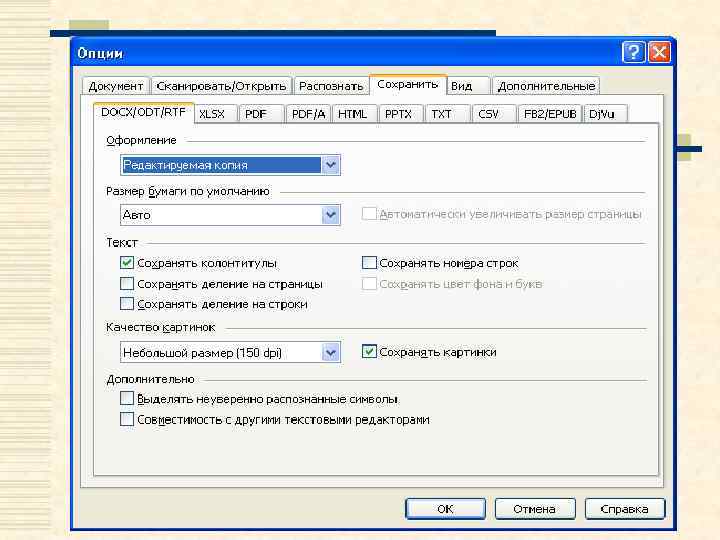 Для сохранения распознанного текста: w в режиме ПРОСТОЙ ТЕКСТ форматирование текста не сохранится; 2) на вкладке СОХРАНИТЬ окна ОПЦИИ устанавливаются настройки сохранения для выбранного формата; 3) нажимается стрелка справа от кнопки СОХРАНИТЬ на главной панели инструментов и выбирается нужная опция, или можно воспользоваться командами меню ФАЙЛ.