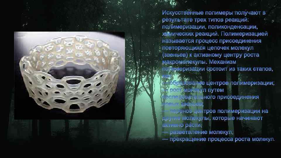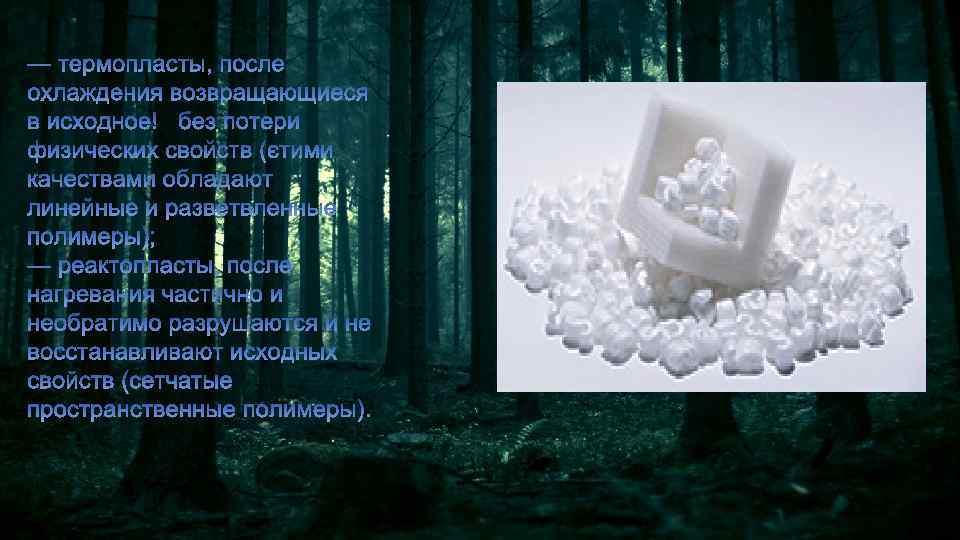 Полимеры существуют в различных агрегатных состояниях: в виде тягучей жидкости (смазки, клеи, лаки и краски, герметики), в виде эластичных материалов (резины, силикон, эластомеры, поролон) и в виде твердых пластмасс (полиэтилен, полипропилен, поликарбонат и т. д. ). Полимеры в качестве химических веществ могут: — образовывать новые химические связи между молекулами; — образовывать новые связи между отдельными звеньями молекулы; — присоединять боковые звенья к основной цепочке молекул; — распадаться на отдельные мономеры.