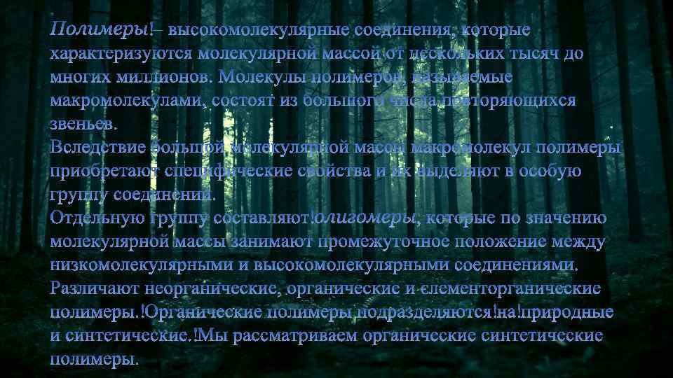 По химическому составу: — органические; — неорганические, не содержащие органических звеньев ни в главной цепи, ни в ответвлениях макромолекулы (пластическая сера, кристаллы кварца); — элементоорганические, макромолекулы которых состоят из углеводородных групп и неорганических звеньев (кремний-, боро-, фосфорорганические полимеры и др. ).