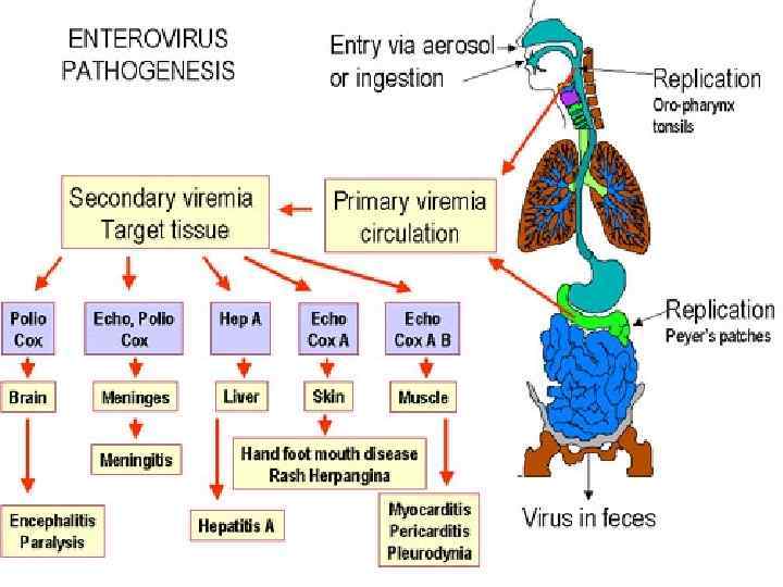 Патогенез • Первичное размножение вируса в носоглотке или кишечнике • Диссеминация вируса в различных органах и тканях, патологический процесс может быть прерван на этой стадии- иннапарантная и абортивная формы болезни • Проникновение вируса в ЦНС через эндотелий мелких сосудов и по периферическим нервам