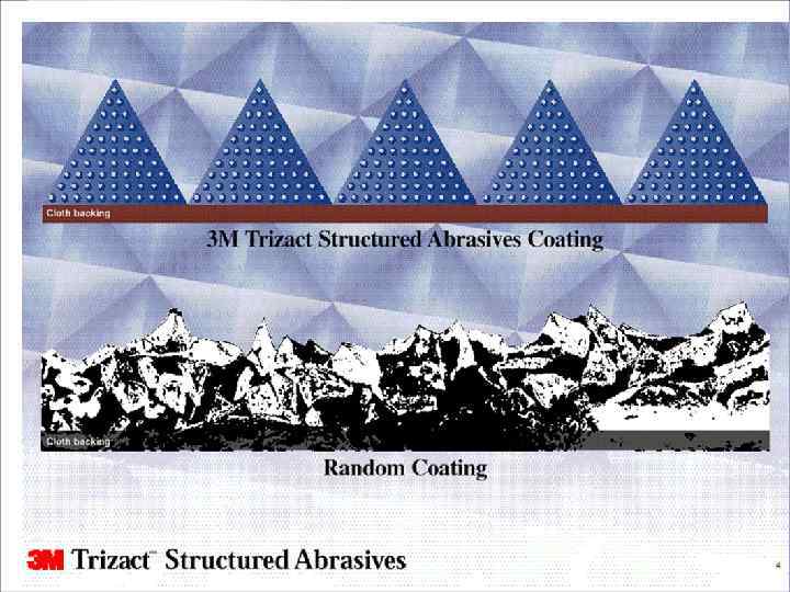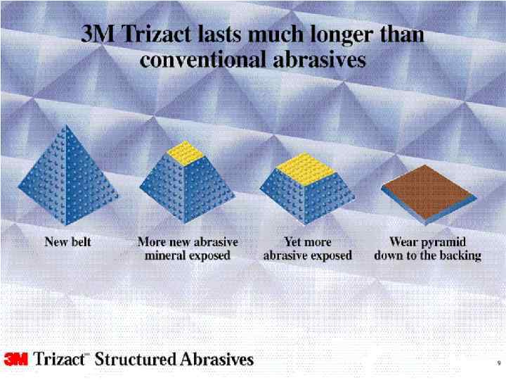 Что является отличительной чертой дисков Trizact ? • Структурный абразив, созданный по технологии микрорепликации Микропирамиды из минерала Когда минерал на верхушке вытирается, в дело вступает более широкая часть пирамидки • Долгий срок использования
