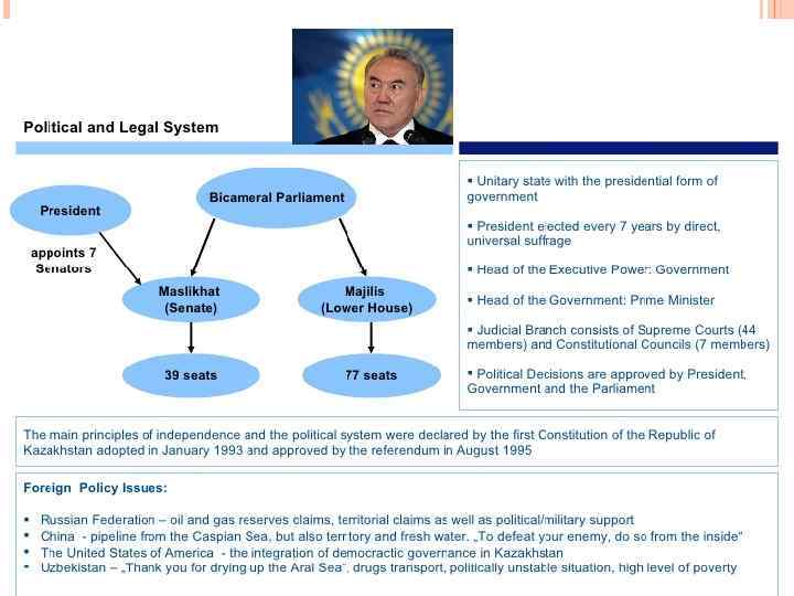 Political system of Kazakhstan According to the Constitution, adopted at the national referendum on August 30, 1995, the Republic of Kazakhstan is a unitary state with a presidential form of government, which has three independent branches: executive, legislative and judicial.