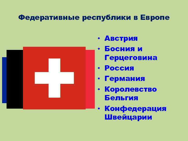 Федеративные республики в Европе • Австрия • Босния и Герцеговина • Россия • Германия • Королевство Бельгия • Конфедерация Швейцарии