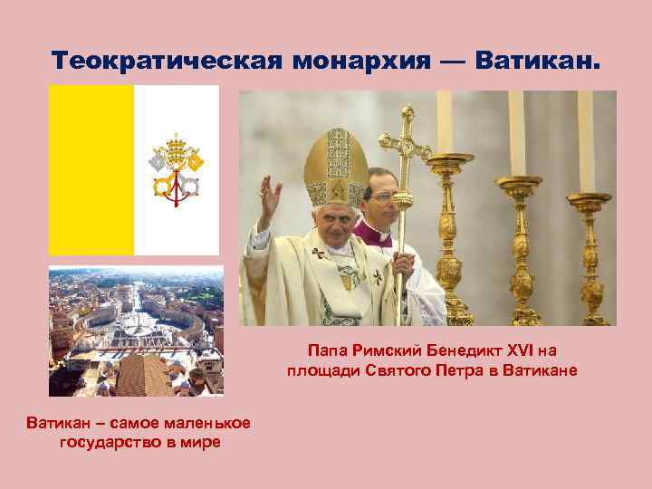 Теократическая монархия — Ватикан. Папа Римский Бенедикт XVI на площади Святого Петра в Ватикане Ватикан – самое маленькое государство в мире