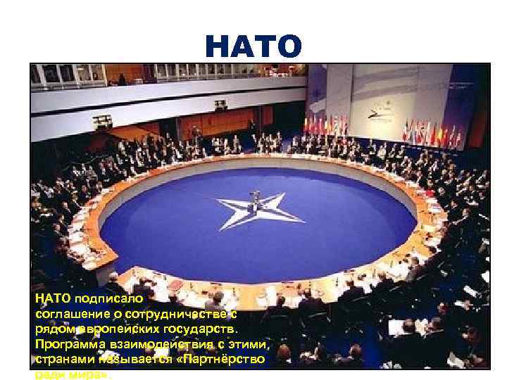 НАТО Крупнейший в мире военно-политический блок, объединяющий большинство стран Европы, США и Канаду. НАТО подписало Основан 4 апреля 1949 с соглашение о сотрудничестве года в США. рядом европейских государств. Программа взаимодействия с этими странами называется «Партнёрство ради мира» .