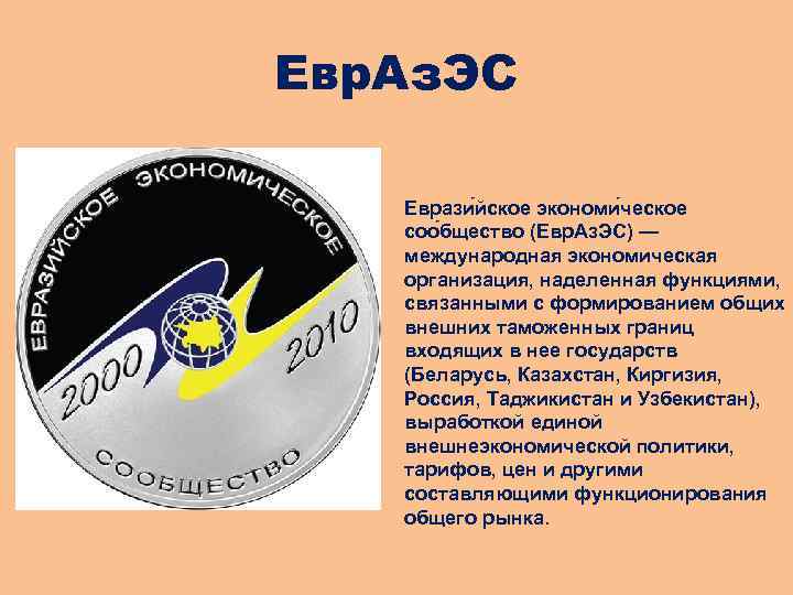 Евр. Аз. ЭС Еврази йское экономи ческое соо бщество (Евр. Аз. ЭС) — международная экономическая организация, наделенная функциями, связанными с формированием общих внешних таможенных границ входящих в нее государств (Беларусь, Казахстан, Киргизия, Россия, Таджикистан и Узбекистан), выработкой единой внешнеэкономической политики, тарифов, цен и другими составляющими функционирования общего рынка.