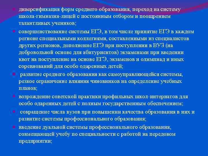 диверсификация форм среднего образования, переход на систему школа гимназия лицей с постоянным отбором и поощрением талантливых учеников; совершенствование системы ЕГЭ, в том числе принятие ЕГЭ в каждом регионе специальными коллегиями, составленными из специалистов других регионов, дополнение ЕГЭ при поступлении в ВУЗ (на добровольной основе для абитуриентов) экзаменами при введении квот на поступление на основе ЕГЭ, экзаменов и олимпиад и иных соревнований для особо одаренных детей; развитие среднего образования как самоуправляющейся системы, резкое ограничение влияния чиновников на определение учебных планов; возрождение советской практики профильных школ интернатов для особо одаренных детей с полным государственным обеспечением; сокращение числа вузов при повышении качества образования в них и развитие системы профессионального образования; введение дуальной системы профессионального образования, совмещающей учебу по специальности с работой на передовом предприятии;
