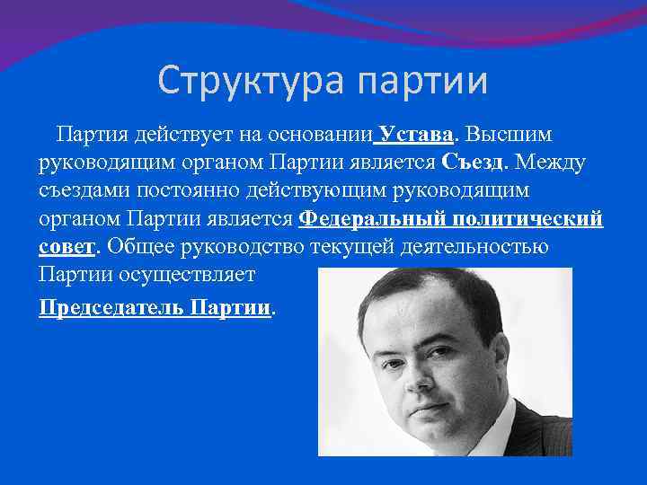 Структура партии Партия действует на основании Устава. Высшим руководящим органом Партии является Съезд. Между съездами постоянно действующим руководящим органом Партии является Федеральный политический совет. Общее руководство текущей деятельностью Партии осуществляет Председатель Партии.