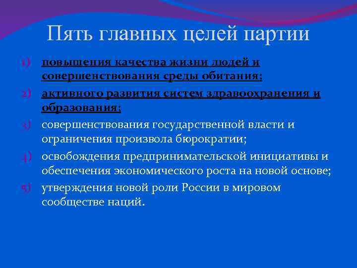 Пять главных целей партии 1) повышения качества жизни людей и совершенствования среды обитания; 2) активного развития систем здравоохранения и образования; 3) совершенствования государственной власти и ограничения произвола бюрократии; 4) освобождения предпринимательской инициативы и обеспечения экономического роста на новой основе; 5) утверждения новой роли России в мировом сообществе наций.
