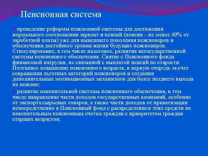 v. Пенсионная система проведение реформы пенсионной системы для достижения нормального соотношения зарплат и пенсий (пенсия – не менее 40% от заработной платы) уже для нынешнего поколения пенсионеров и обеспечения достойного уровня жизни будущих пенсионеров. Стимулирование, в том числе налоговое, развития негосударственной системы пенсионного обеспечения. Снятие с Пенсионного фонда финансовой нагрузки, не связанной с выплатой пенсий по старости. Поэтапное повышение пенсионного возраста, в первую очередь за счет сокращения льготных категорий пенсионеров и создания дополнительных мотивационных механизмов для более позднего выхода на пенсию; развитие накопительной системы пенсионного обеспечения, в том числе направление части доходов государственных компаний, особенно от экспорта сырьевых товаров, а также части доходов от приватизации непосредственно в Пенсионный фонд с распределением этих средств по накопительным пенсионным счетам граждан с приоритетом граждан старших возрастов;