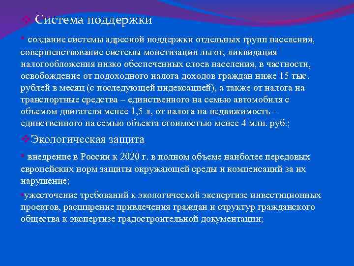v Система поддержки • создание системы адресной поддержки отдельных групп населения, совершенствование системы монетизации льгот, ликвидация налогообложения низко обеспеченных слоев населения, в частности, освобождение от подоходного налога доходов граждан ниже 15 тыс. рублей в месяц (с последующей индексацией), а также от налога на транспортные средства – единственного на семью автомобиля с объемом двигателя менее 1, 5 л, от налога на недвижимость – единственного на семью объекта стоимостью менее 4 млн. руб. ; v. Экологическая защита • внедрение в России к 2020 г. в полном объеме наиболее передовых европейских норм защиты окружающей среды и компенсаций за их нарушение; • ужесточение требований к экологической экспертизе инвестиционных проектов, расширение привлечения граждан и структур гражданского общества к экспертизе градостроительной документации;