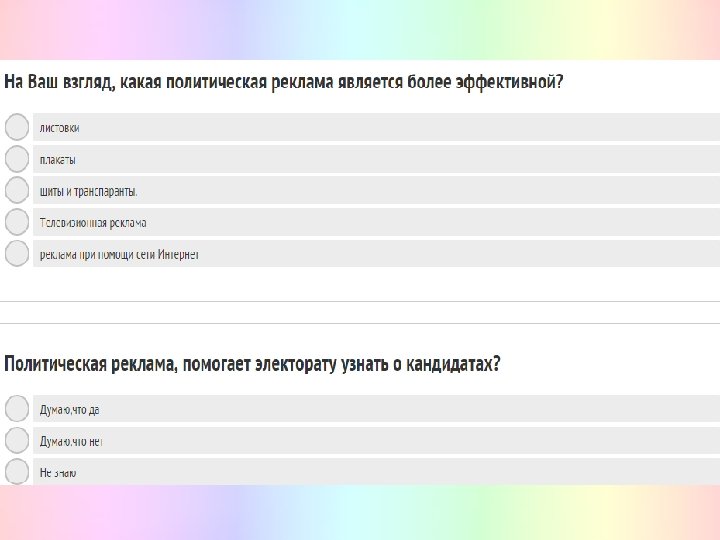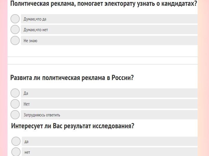 Политическая реклама в российских избирательных кампаниях следующая : 1)Сейчас широко используется интернет, создание сайтов и интернет-рекламы программ. 2)Почтовая рассылка – она успешно использовалась ещё в 1991 г. 3)Благотворительные акции и кампании – очень эффективный способ институциональной рекламы. 4)Привлечение людей, которые восхваляют кандидата – «свидетельство» . 5)Плакаты и листовки – начали успешно использоваться ещё со времён революции 1917 г. . Политическая реклама нужна: 1)чтобы имя кандидата везде узнавали 2)чтобы его программа была популярна, и все проблемы обсуждались 3)хороший имидж