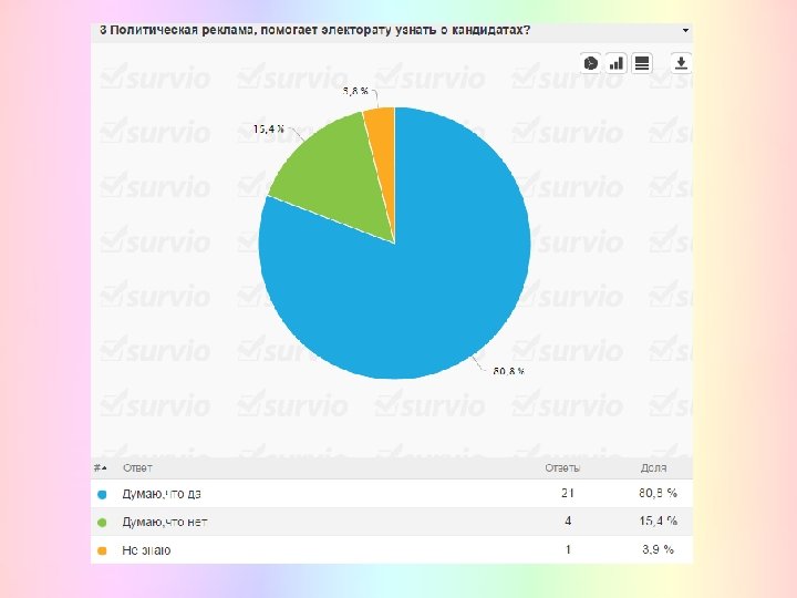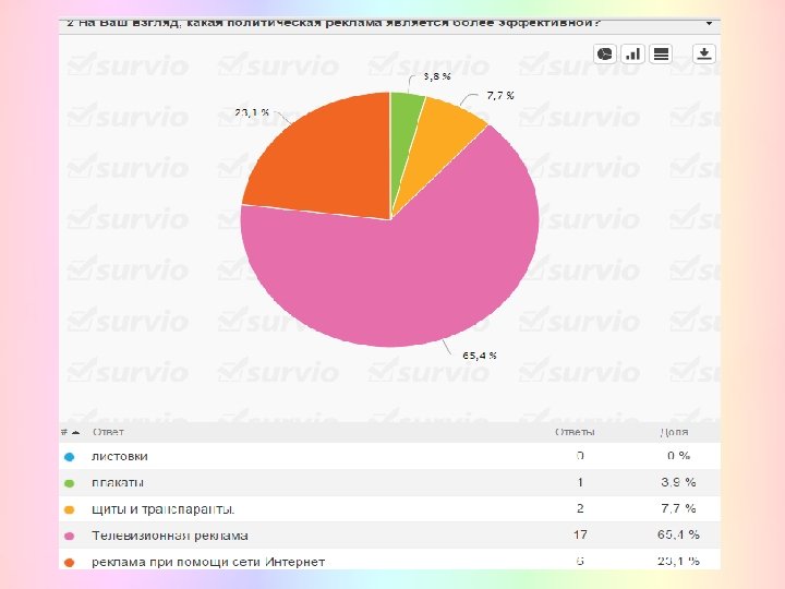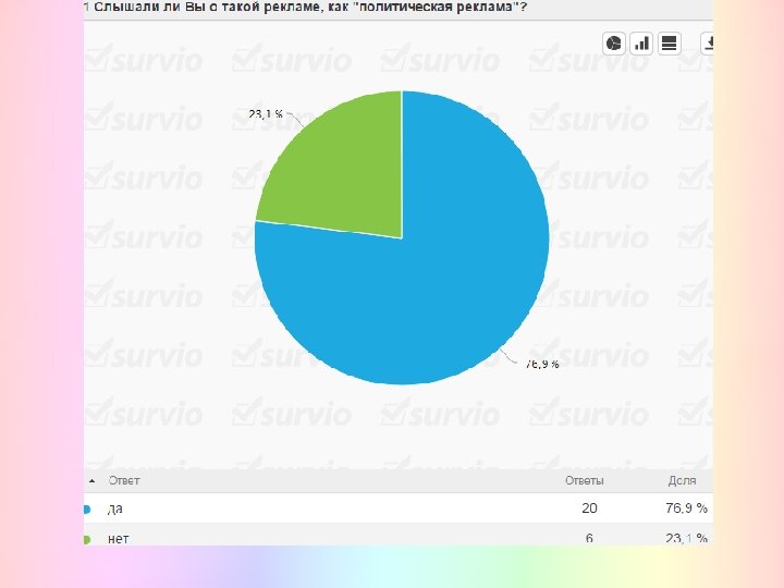Всего было составлено 5 вопросов, а опрашиваемых составляло 26 чел. Опрос был проведен при помощи Интернета, а именно через сайт Survio, который помог в короткий срок помог провести опрос не только среди своей группы, но и среди других факультетов академии