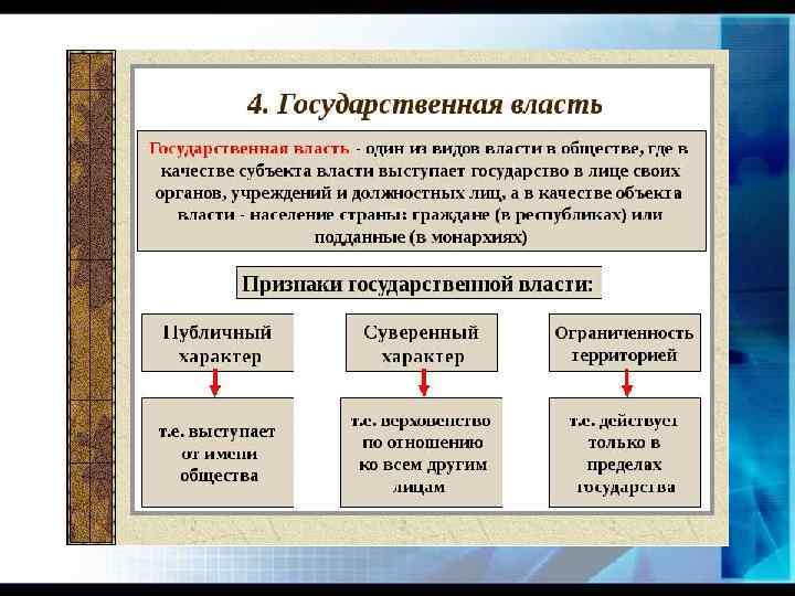 Страна-территория. Государство- в широком смысле = страна Государство- в узком смысле- организация политической власти, осуществляющая управление обществом и обладающая суверенитетом.