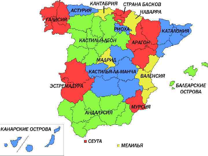 Административно-территориальное устройство. • Испания – унитарное государство, в котором существует трехуровневое деление на субъекты: автономные сообщества (17 + 2 автономных города), провинции (50 + 2), муниципалитеты. • Система территориального деления в Испании асимметрична. • Автономные сообщества имеют достаточно широкий спектр полномочий, однако государство сохраняет за собой ряд исключительных компетенций. Также существует система контроля деятельности автономий со стороны центральной власти.