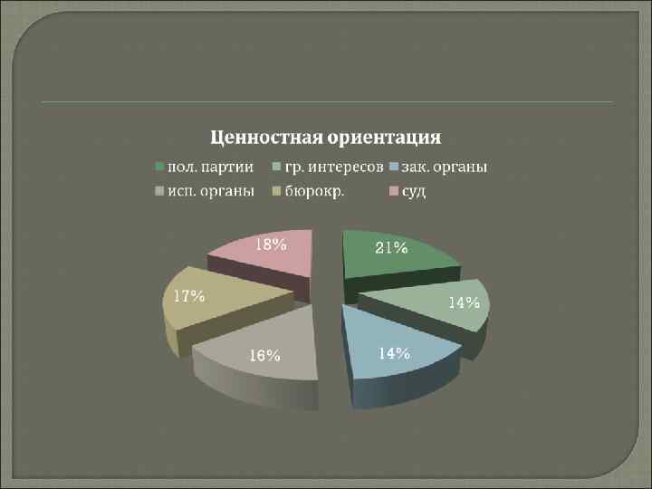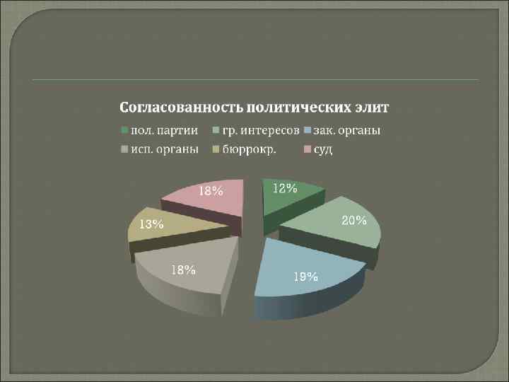 Влияние политических традиций на политическую систему Регионали зм ~0, 55 Согласова Этатизм ~0, 5 нность политиче ских элит ~0, 7 Ценностн ая ориентац ия ~0, 4 Партикул яризм ~0, 7 Политические партии 0, 3 0, 5 0, 7 0, 65 Группы интересов 0, 7 0, 8 0, 3 0, 4 0, 7 Законодательн ые органы 0, 6 0, 75 0, 4 0, 55 Исполнительны е о. 0, 3 0, 7 0, 55 0, 45 0, 7 Бюрократия 0, 7 0, 5 0, 4 0, 5 0, 65 Суды 0, 7 0, 3 0, 5 0, 6