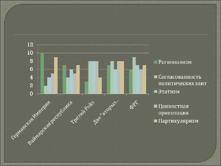 Политические традиции Регионализм(16 земель) Системная согласованность германской политической элиты Этатизм Ценностная ориентация Партикуляризм