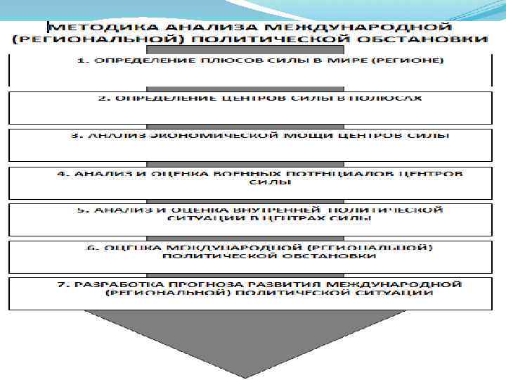 Процесс политического анализа этап концептуализации проблемы - предполагает рассмотрение конкретной ситуации с точки зрения ее влияния на реализацию интересов важнейших политических субъектов, на деятельность органов государственного управления, их взаимодействия с зарубежными партнерами и вообще существенное изменение политического контекста (сбор информации, формулировку проблемы с характеристикой ее наиболее отличительных черт и структурных компонентов, отличий от иных проблемных ситуаций). этап моделирования проблемы – создание целостной модели на основе определенной исследовательской гипотезы, в рамках которой выявляются и уточняются важнейшие параметры проблемы. этап составления программы исследования конкретной проблемы – программы с уточнением характеристик проблем; три вида: прогностические, направленные на исследование будущей гипотетической ситуации; актуальные, связанные с анализом текущей ситуации, и ретроспективные, ориентированные на поиск новых подходов к прочтению уже произошедших событий. этап выбора методов исследования проблемы и решения конкретной задачирешение любой конкретной задачи всегда предполагает выбор приоритетных средств и приемов исследования, который определяется характером самой проблемы, подготовленностью аналитиков, условиями, в которых осуществляется анализ. Выбор метода требует сочетания качественных и количественных, теоретических и эмпирических подходов и т. д. Но методы могут разниться по своей форме ( «мозговой штурм» , индивидуальная или групповая экспертиза и т. д. ).