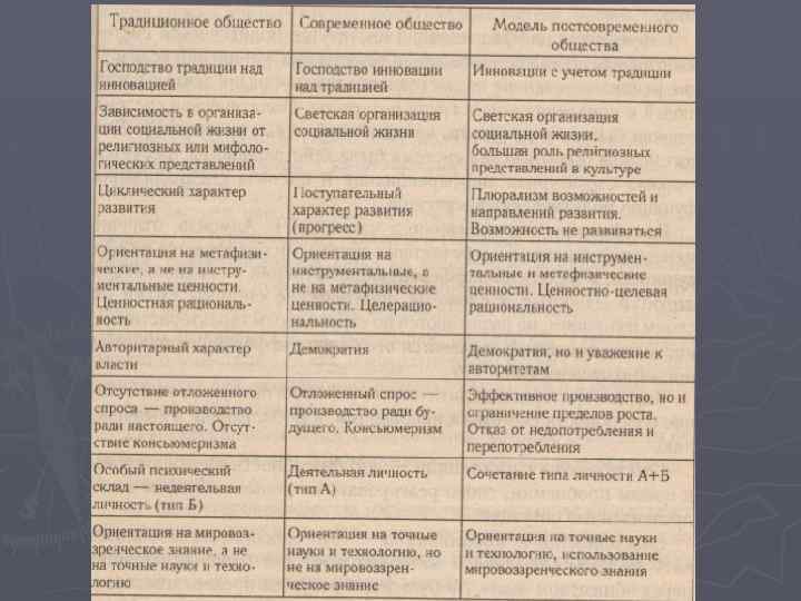 ► Преобразование традиционного общества вызвано различными факторами и причинами — от военных поражений и захватов, иных контактов (торгово-экономических, информационных) с более развитыми государствами, до миграционных потоков, привносящих элементы «вестернизации» , появления «модернизаторских» элитарных групп, которые состоят из людей, как правило, получивших образование в индустриальных странах. ► В любом случае из-за неизбежного внутреннего расслоения традиционное общество поднимается на уровень переходного. ► Показательно, что в XIV—XVIII вв. в переходном состоянии пребывали многие западные общества, которые обрели статус современного относительно недавно, к началу — середине XIX вв. ► Традиционное и современное общества отличаются по базовым социальным параметрам, которые предложил еще 1950 -х гг. Т. Парсонс. (см. таблицу).
