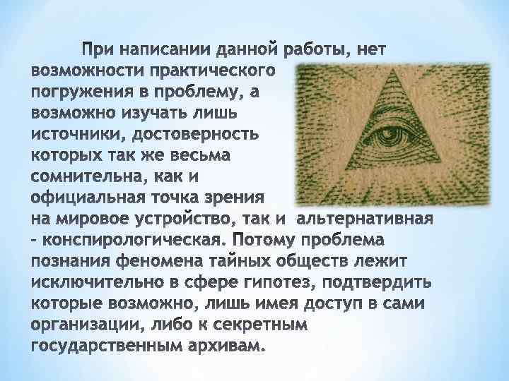 *Изучение темы «конспирология» с точки зрения новейших отечественных и зарубежных исследований по сходной проблематике; *Поиск результирующей не противоречащей информации для выявления и структурирования сведений о возможных тайных обществах.