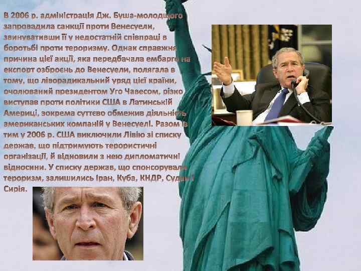 Свій уряд він сформував із представників різноманітних напрямків і поглядів - від лібералів до жорстких консерваторів. У перші місяці свого урядування Дж. Буш-молодший приділяв основну увагу внутрішнім справам держави. А незабаром прийшов день 11 вересня 2001 р. , який став поворотним моментом у сучасній історії США. Адміністрація Дж. Буша -молодщого відразу ж опанувала ситуацію і взяла її під свій контроль. Було встановлено, що організатором та виконавцем замахів є таємна, розгалужена по багатьох країнах, ісламістська структура "Аль-Каїда", яку очолює релігійний фанатик із Саудівської Аравії Усама Бен Ладен. Дж Бушмолодший оголосив, що Сполучені Для боротьби з тероризмом було створено Штати перебувають у стані війни Управління безпеки країни, яке дістало проти міжнародного тероризму і майже необмежені права щодо осіб, вестимуть цю війну, доки підозрюваних у ворожих намірах. Завдяки противника не буде розгромлено, вжитим заходам упродовж усіх наступних яких би зусиль це не потребувало років на території країни не було вчинено жодного серйозного терористичного акту.