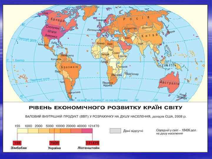 § § § Величина ВВП у розрахунку на одного жителя країни – більш об’єктивний показник. Він дає змогу оцінити загальний економічний рівень розвитку країни та оперувати поняттями «бідна–багата» країна. Відповідно до величини цього показника країни світу об'єднано в п’ять груп: 1) найбідніші, в яких на одну особу припадає менш як 1 000 дол. США за рік; 2) бідні – 1 – 2 999 дол. США; 3) країни середнього статку – 3 – 9 999 дол. США; 4) заможні – 10 000 – 29 999 дол. США; 5) багаті – понад 30 000 дол. США (мал. 19).