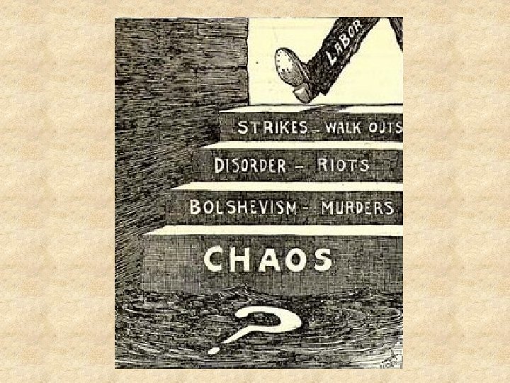 Labor Movement Struggles in the Twenties • During World War I & continuing into the 1920 s, wages had not kept up with prices. • Employers tried to avoid wage increases & tried to discourage labor unions. • Many employers tried to stir up rumors that union members were planning revolution. • Newspapers published fearful headlines like: – – – “Crimes Against Society” “Conspiracies Against the Government. ” “Plots to Establish Communism” • The picture shows an IWW labor union office that was raided by federal authorities searching for communist revolutionary activities.