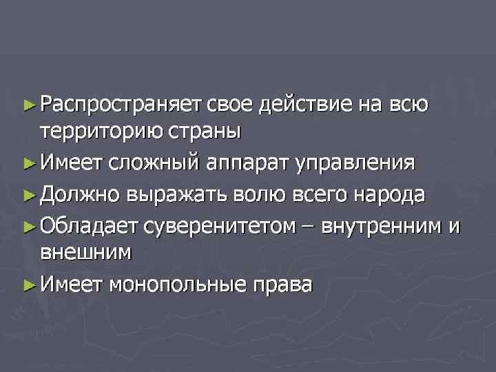 Всеобщий и безличный характер власти (исключение – диктатура, абсолютная монархия): • Власть в современном обществе всегда разделена между отдельными людьми, группировками, партиями, институтами. • Всеобщность политической власти означает, что она действует в масштабах всего государства и действует на территории всей страны.