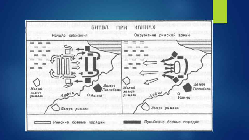 Карфагенская армия Ганнибала нанесла сокрушительное поражение превосходящей её по численности римской армии. Считается, что по числу жизней, потерянных в один день, Канны попадают в число тридцати самых кровопролитных сражений во всей человеческой истории, а также одновременно являются одним из наиболее известных примеров окружения численно превосходящих сил противника.