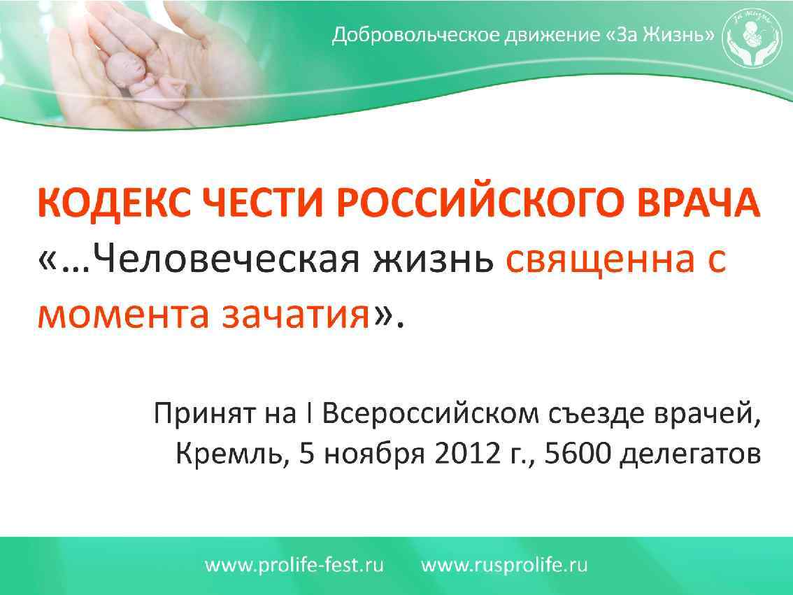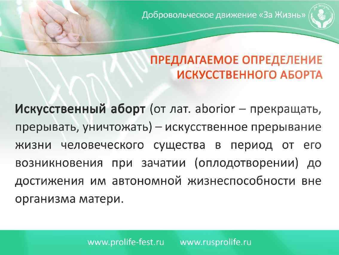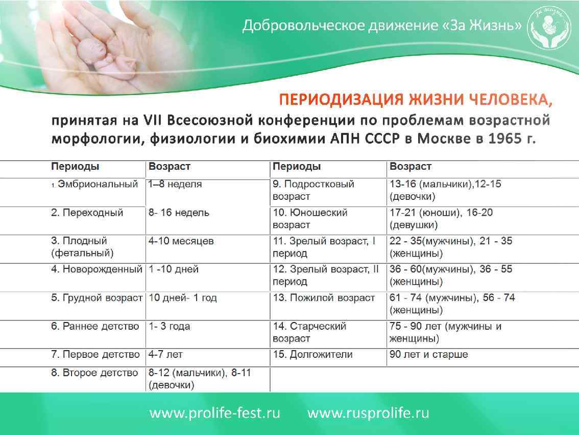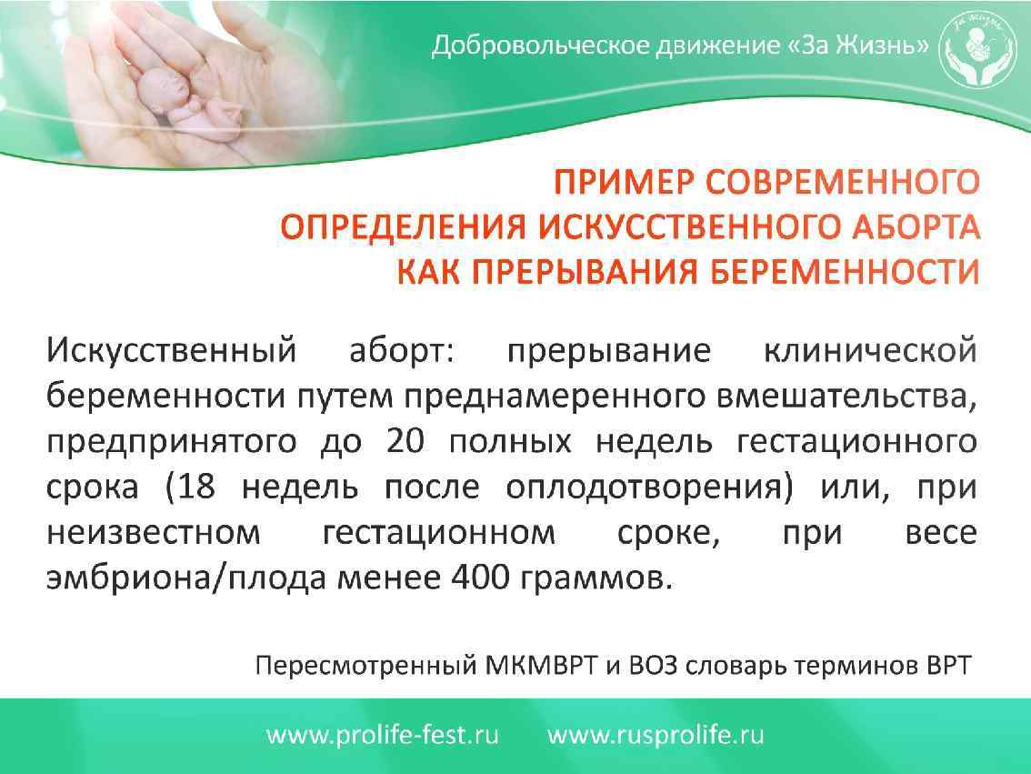 Когда начинается жизнь? - С момента зачатия (страны, где запрещены аборты) - С момента сердцебиения (инициатива в США). - С 12 -й недели включительно (аборты по требования в России) - С 14 -й (Румыния), - С 16 -й (Швеция) - С 18 -й (Португалия) - С момента рождения (США, Канада).