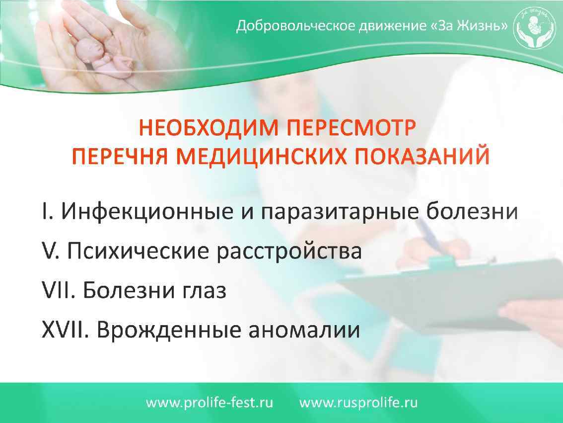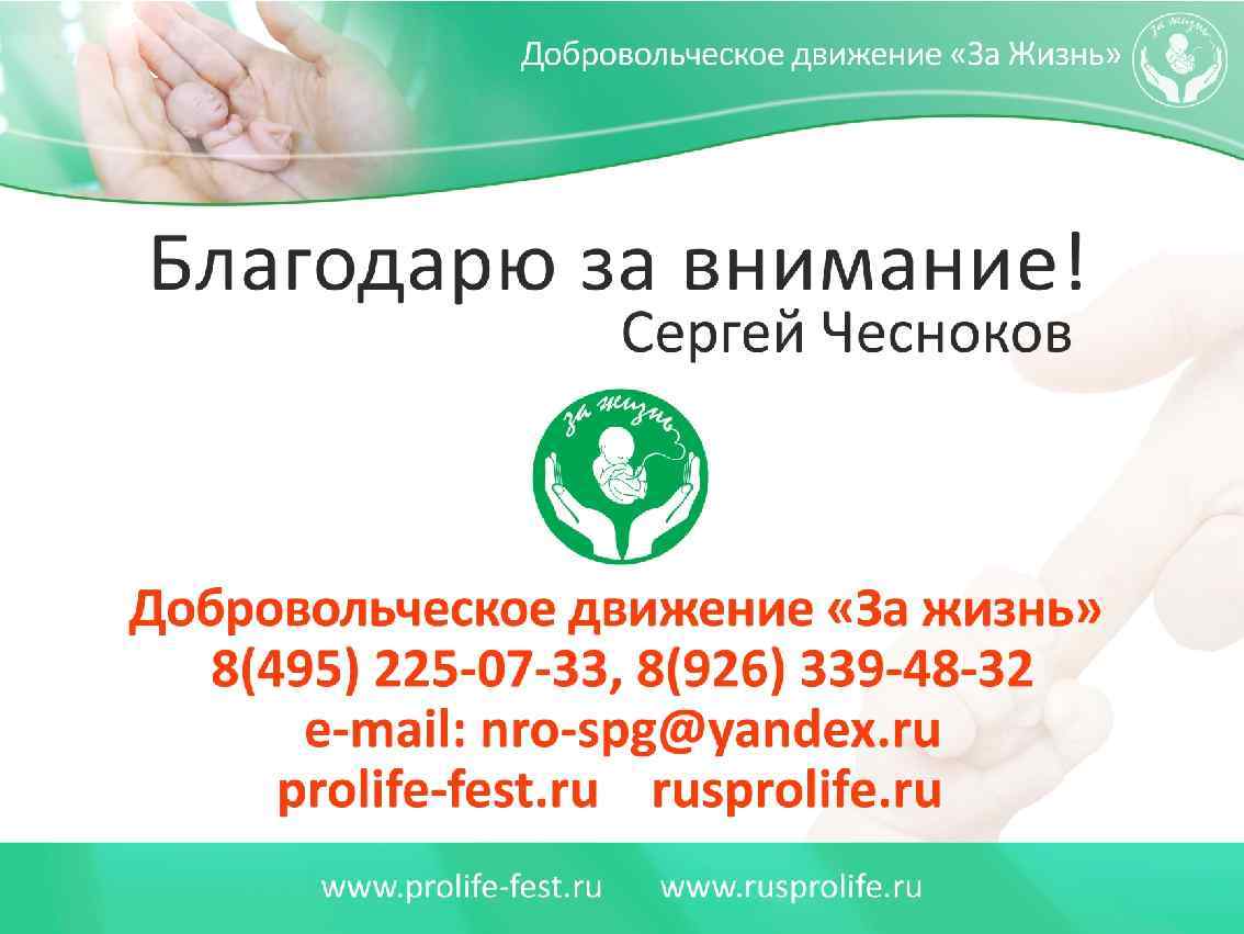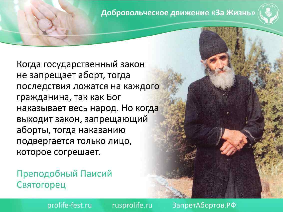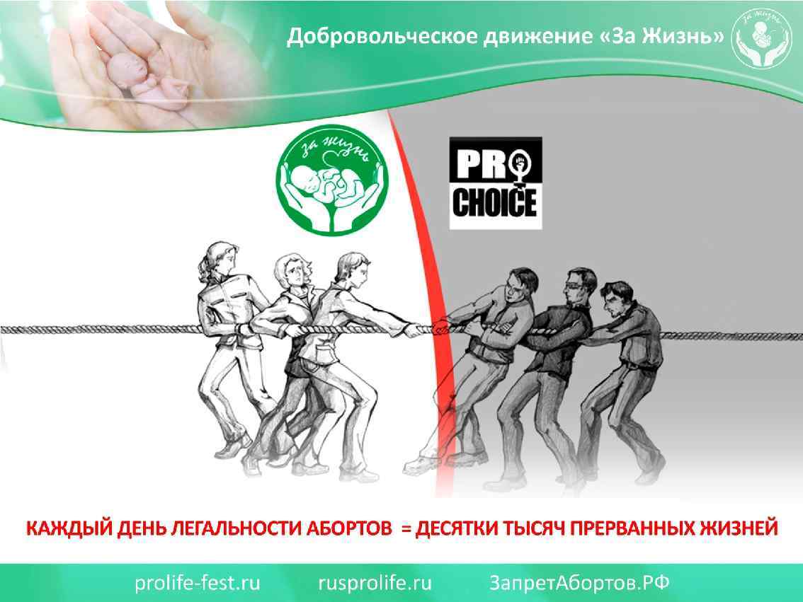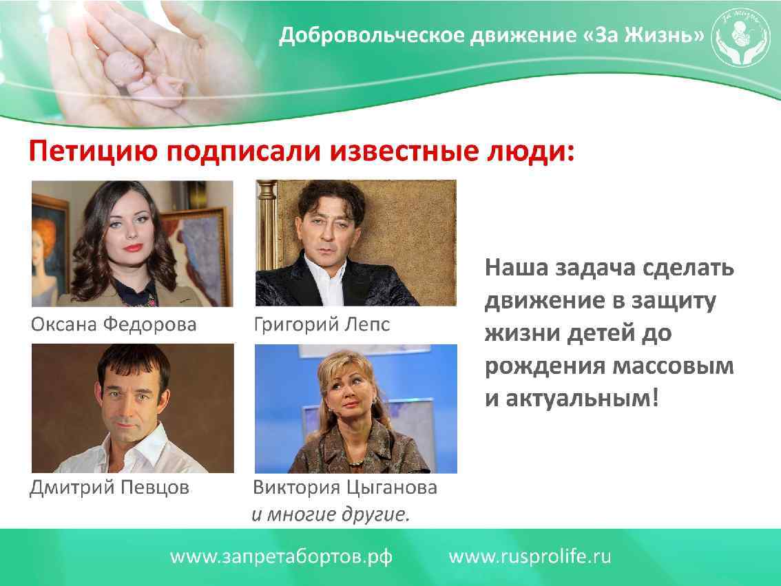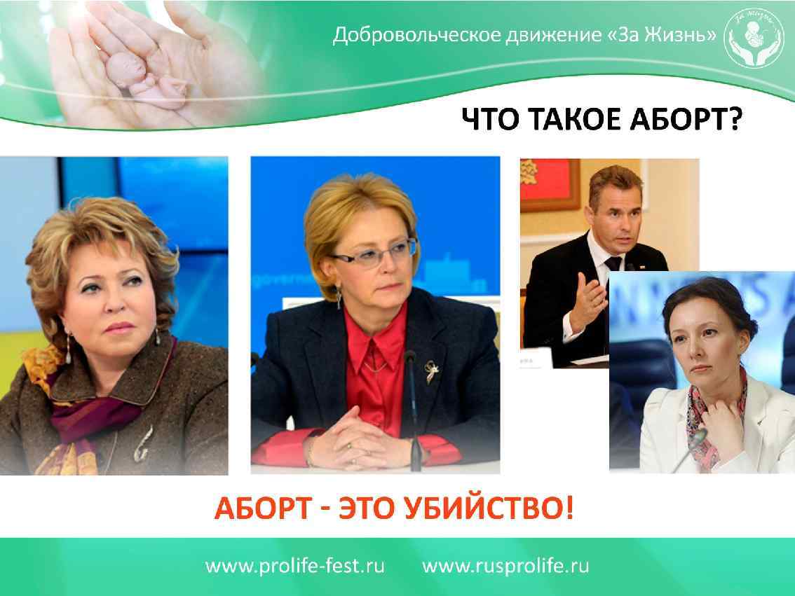 С кем Вы? За прекращение многомилионных убийств детей в нашей стране выступают: 1. Все здоровые общественные силы, которые выступают за утверждение в обществе традиционных семейных ценностей. 2. Все патриоты России, которых волнует утрачиваемый, многомиллионный человеческий потенциал, демографическое будущее нашей страны, созданной нашими великими предками. 3. Представители всех традиционных религиозных конфессий России. 4. Все родители, которые хотят счастья и здоровья своим детям. 5. Все честные врачи акушеры и гинекологи, сопричастные к зарождению новой человеческой жизни. 6. Психологи и психотерапевты, которые оказывают постоянную помощь женщинам, переживающим психологические страдания. 7. Граждане России всех возрастов, конфессий и национальностей, которые пострадали от узаконенных абортов.